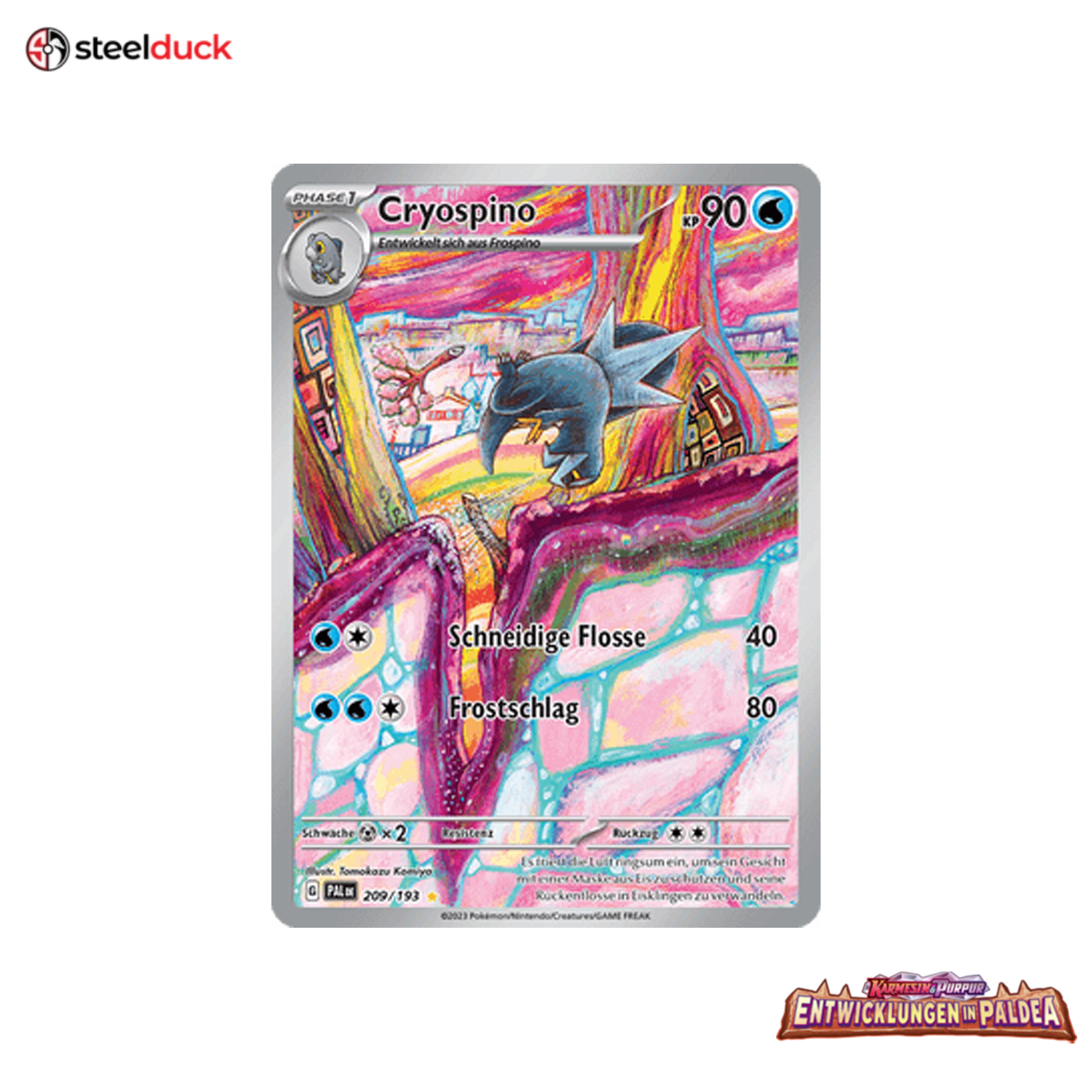 Die Karte Cryospino stammt aus dem beliebten Pokémon-Set Entwicklungen in Paldea und ist ein echtes Highlight für jede Sammlung.