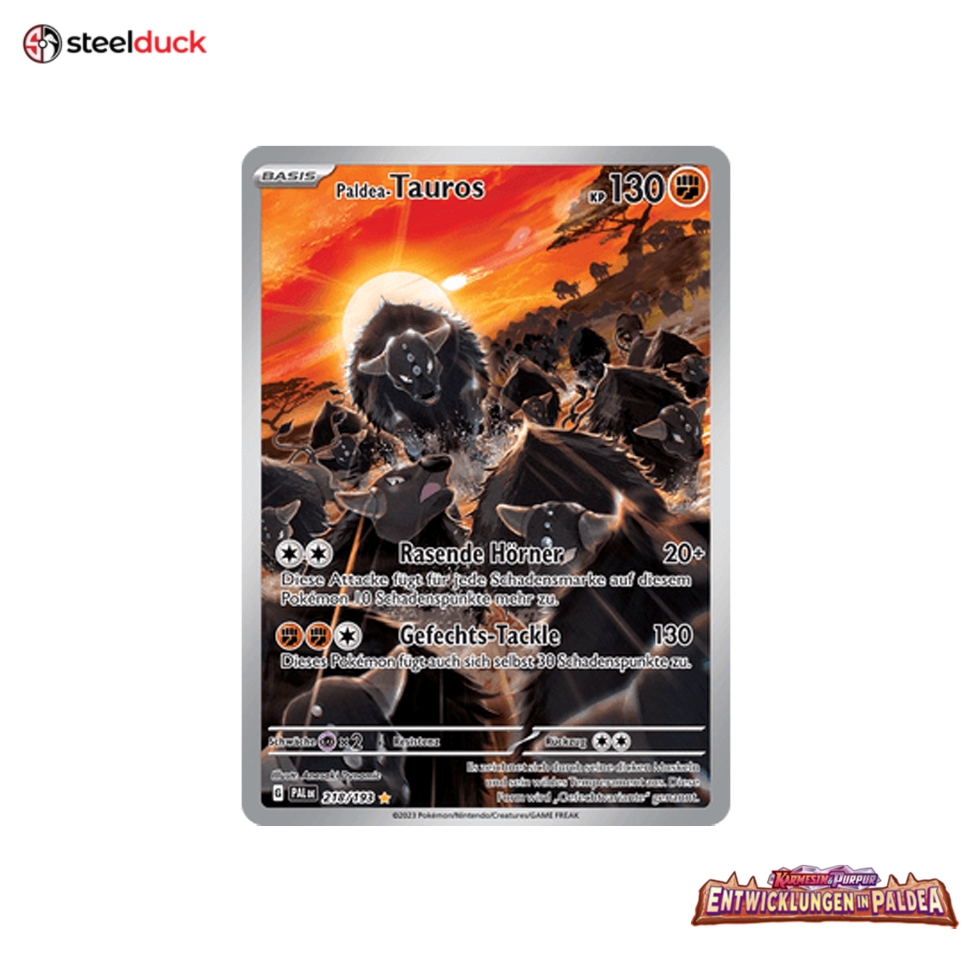 Die Karte Paldea-Tauros stammt aus dem beliebten Pokémon-Set Entwicklungen in Paldea und ist ein echtes Highlight für jede Sammlung.