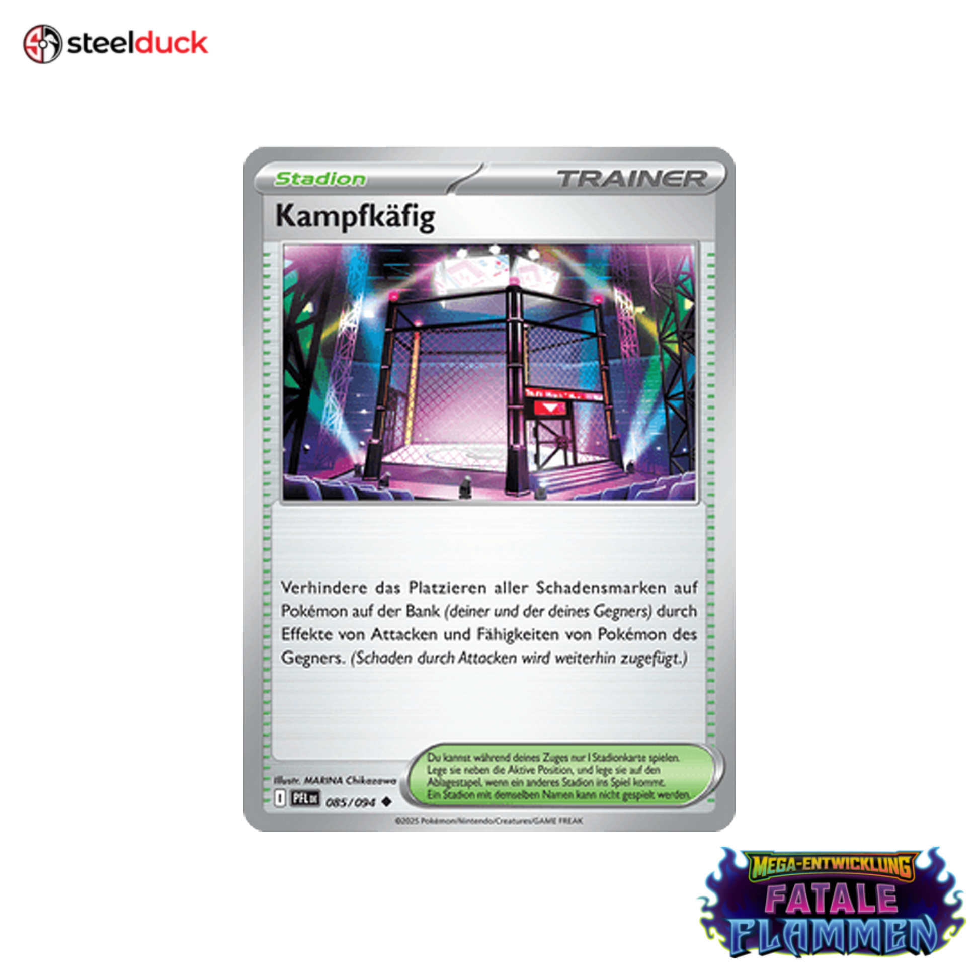 Die Karte Kampfkäfig stammt aus dem beliebten Pokémon-Set Fatale Flammen und ist ein echtes Highlight für jede Sammlung.
