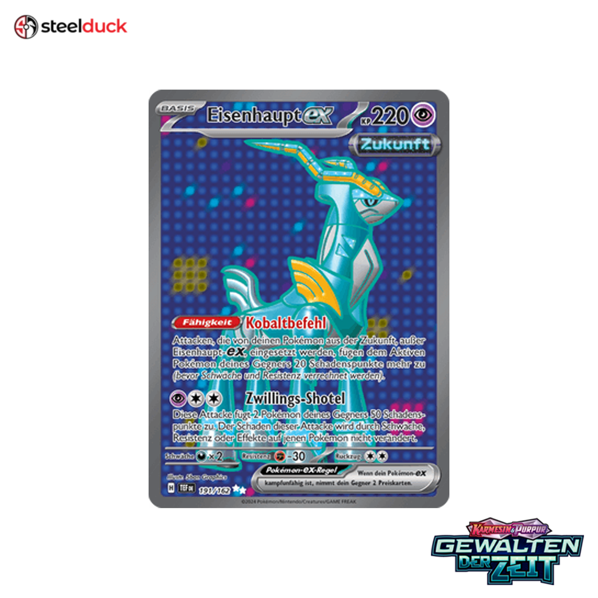 Die Karte Eisenhaupt ex stammt aus dem beliebten Pokémon-Set Gewalten der Zeit und ist ein echtes Highlight für jede Sammlung.