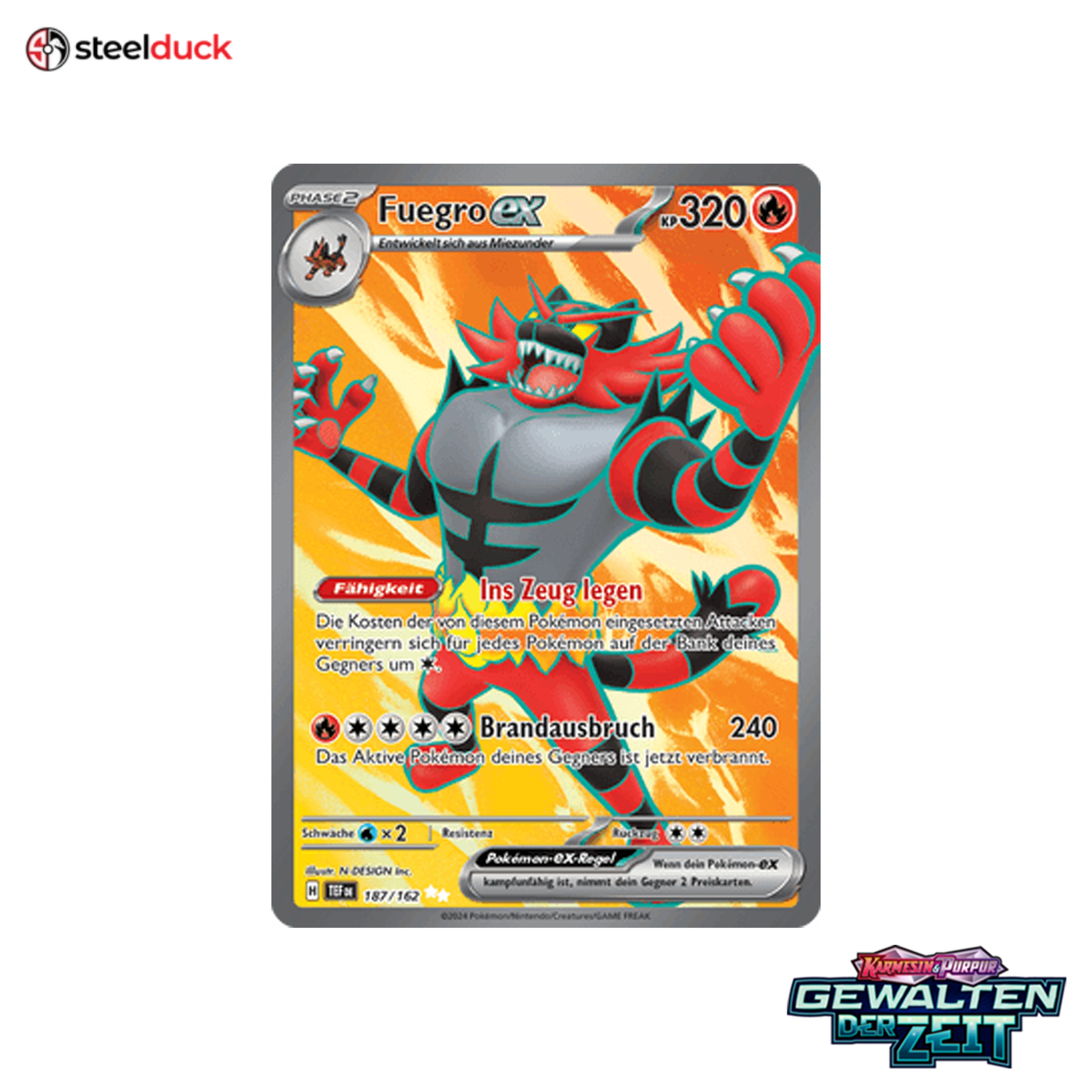 Die Karte Fuegro ex stammt aus dem beliebten Pokémon-Set Gewalten der Zeit und ist ein echtes Highlight für jede Sammlung.