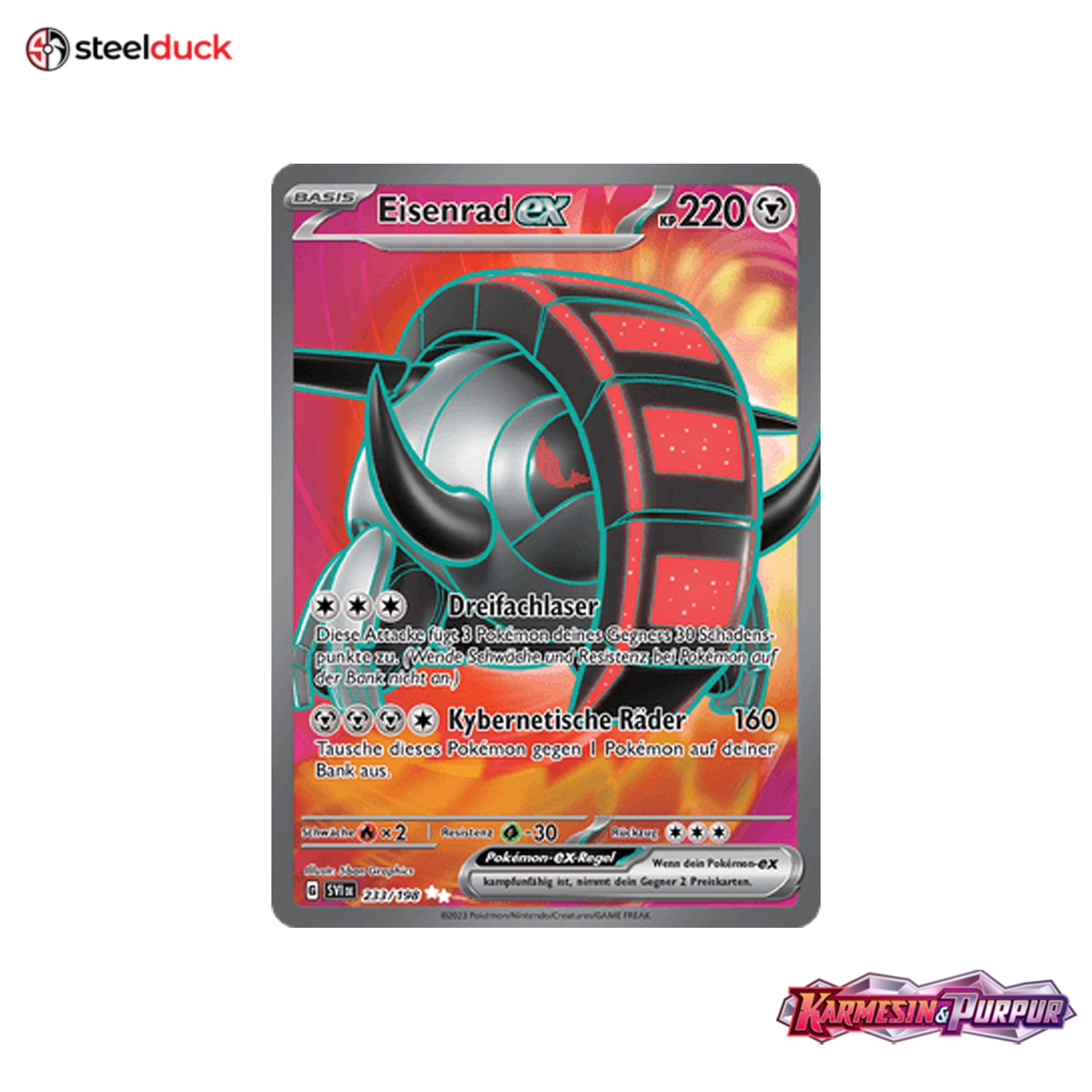Die Karte Eisenrad ex stammt aus dem beliebten Pokémon-Set Karmesin & Purpur und ist ein echtes Highlight für jede Sammlung.