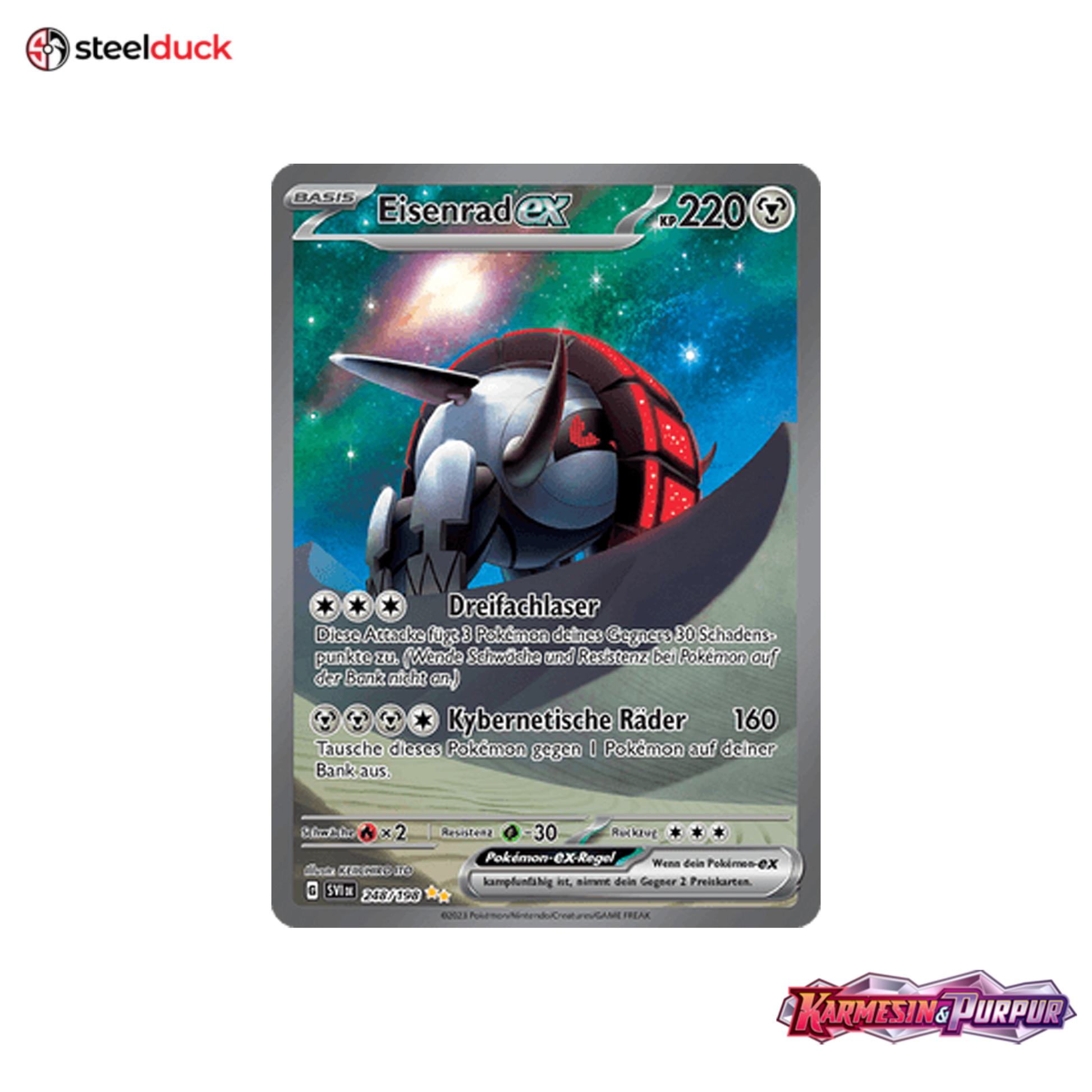Die Karte Eisenrad ex stammt aus dem beliebten Pokémon-Set Karmesin & Purpur und ist ein echtes Highlight für jede Sammlung.