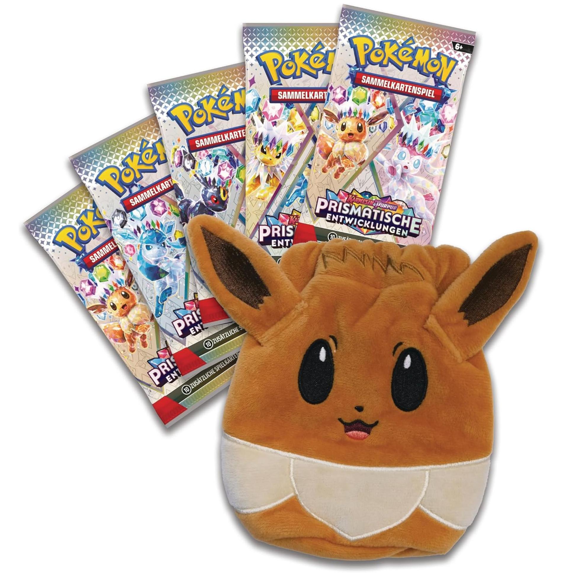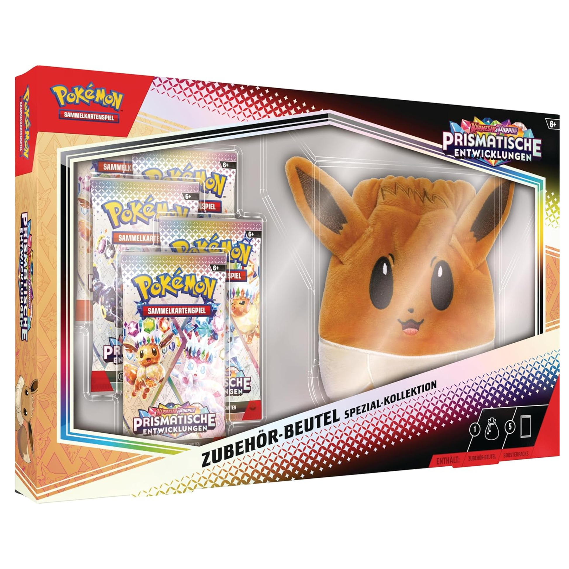 Für alle, die „cute + pulls“ wollen: Du bekommst den Evoli‑Zubehörbeutel als Hingucker und dazu gleich mehrere Booster aus Prismatische Entwicklungen für den Opening‑Moment.