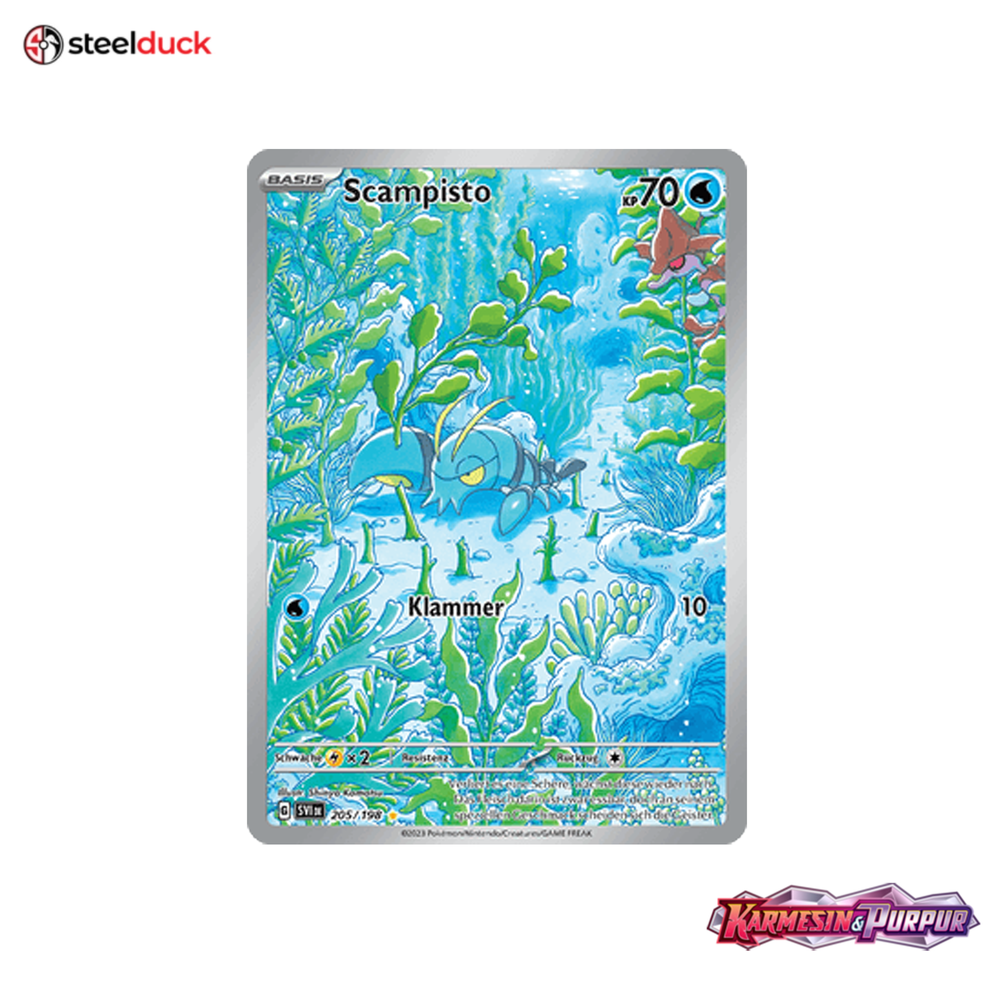 Die Karte Scampisto stammt aus dem beliebten Pokémon-Set Karmesin & Purpur und ist ein echtes Highlight für jede Sammlung.