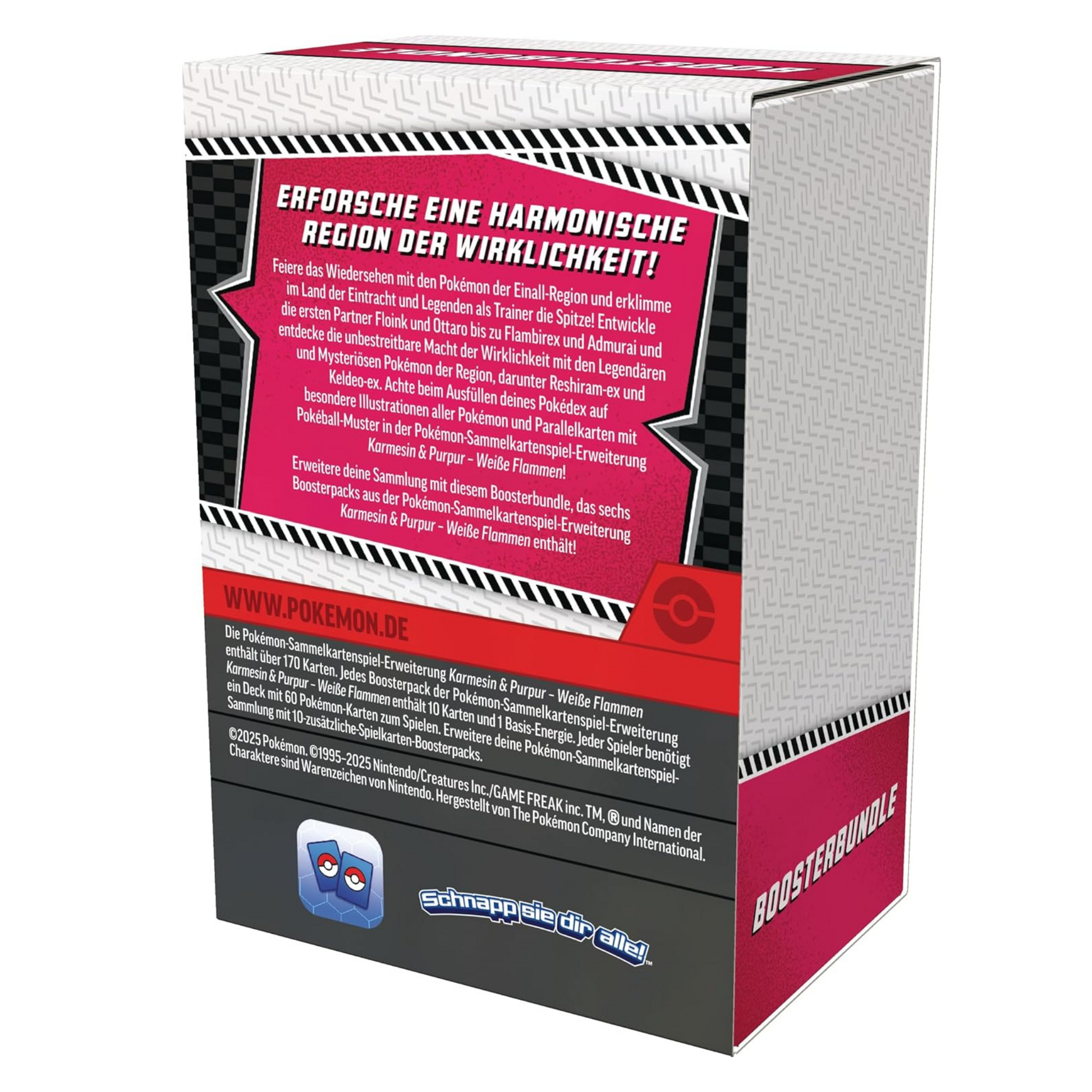 Sichere dir dieses Boosterbundle mit 6 Boosterpacks der Pokémon-Sammelkartenspiel-Erweiterung Karmesin & Purpur – Weiße Flammen! (Jedes Boosterpack enthält 10 Spielkarten sowie 1 Basis-Energie. Karten variieren je nach Boosterpack.)