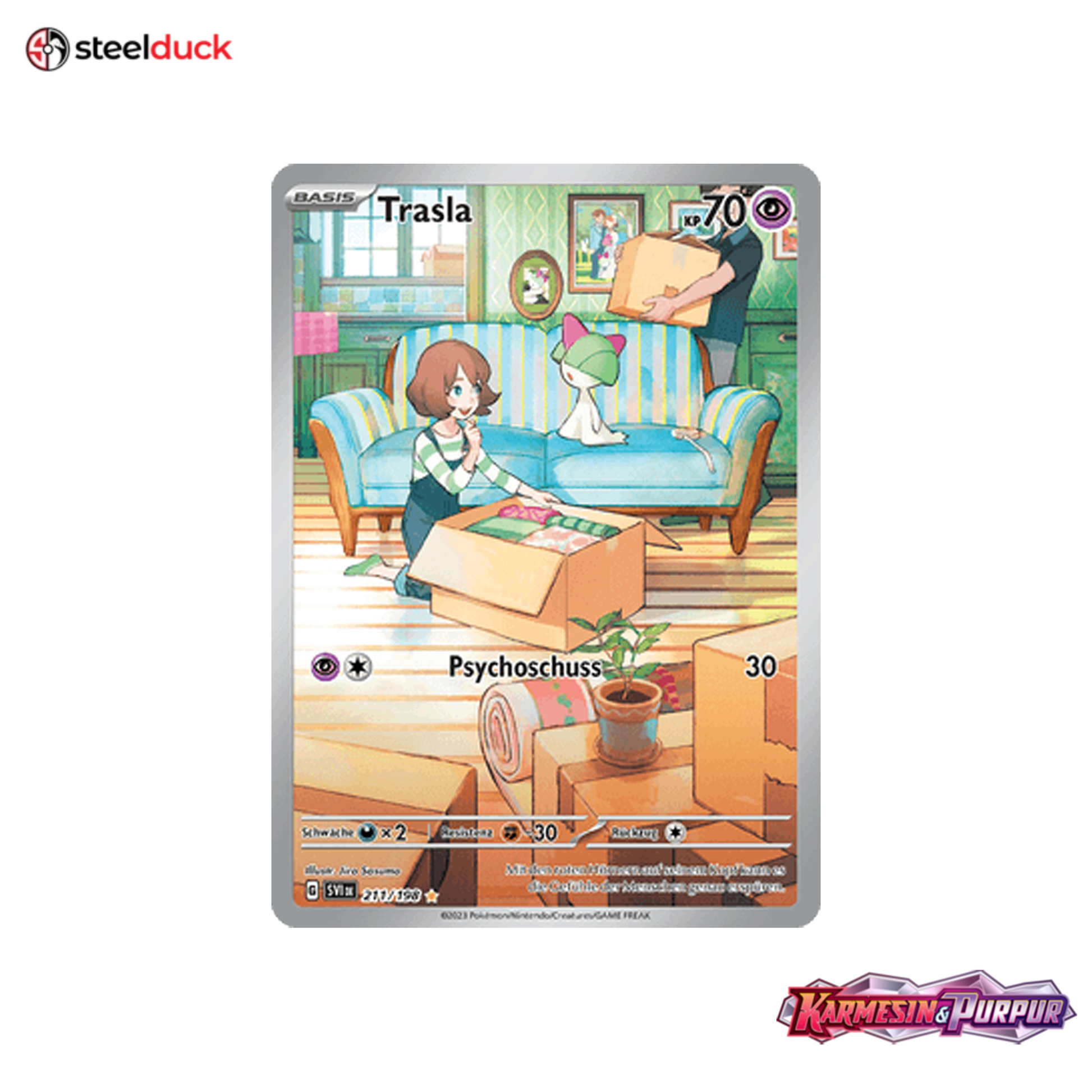 Die Karte Trasla stammt aus dem beliebten Pokémon-Set Karmesin & Purpur und ist ein echtes Highlight für jede Sammlung.