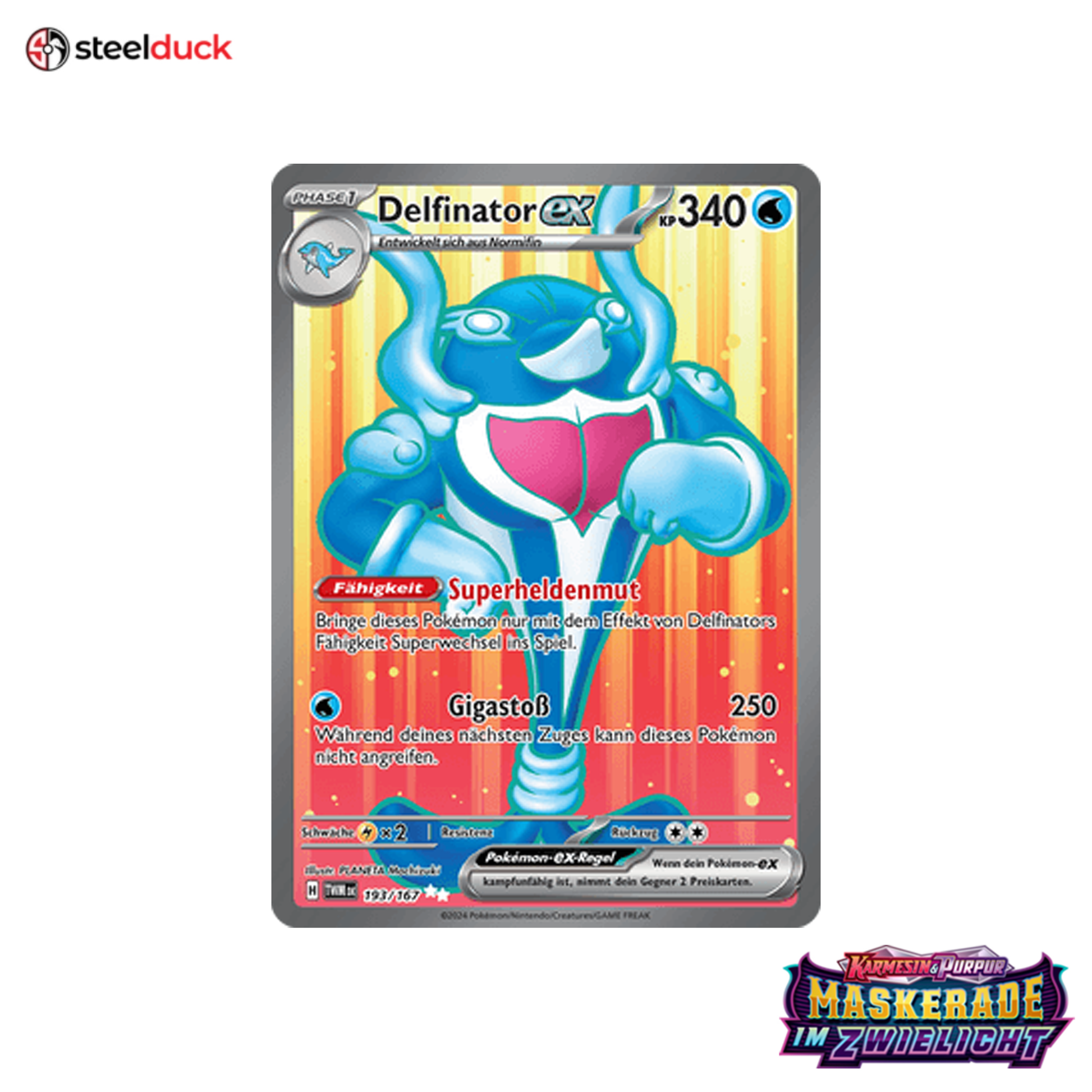 Die Karte Delfinator ex stammt aus dem beliebten Pokémon-Set Maskerade im Zwielicht und ist ein echtes Highlight für jede Sammlung.