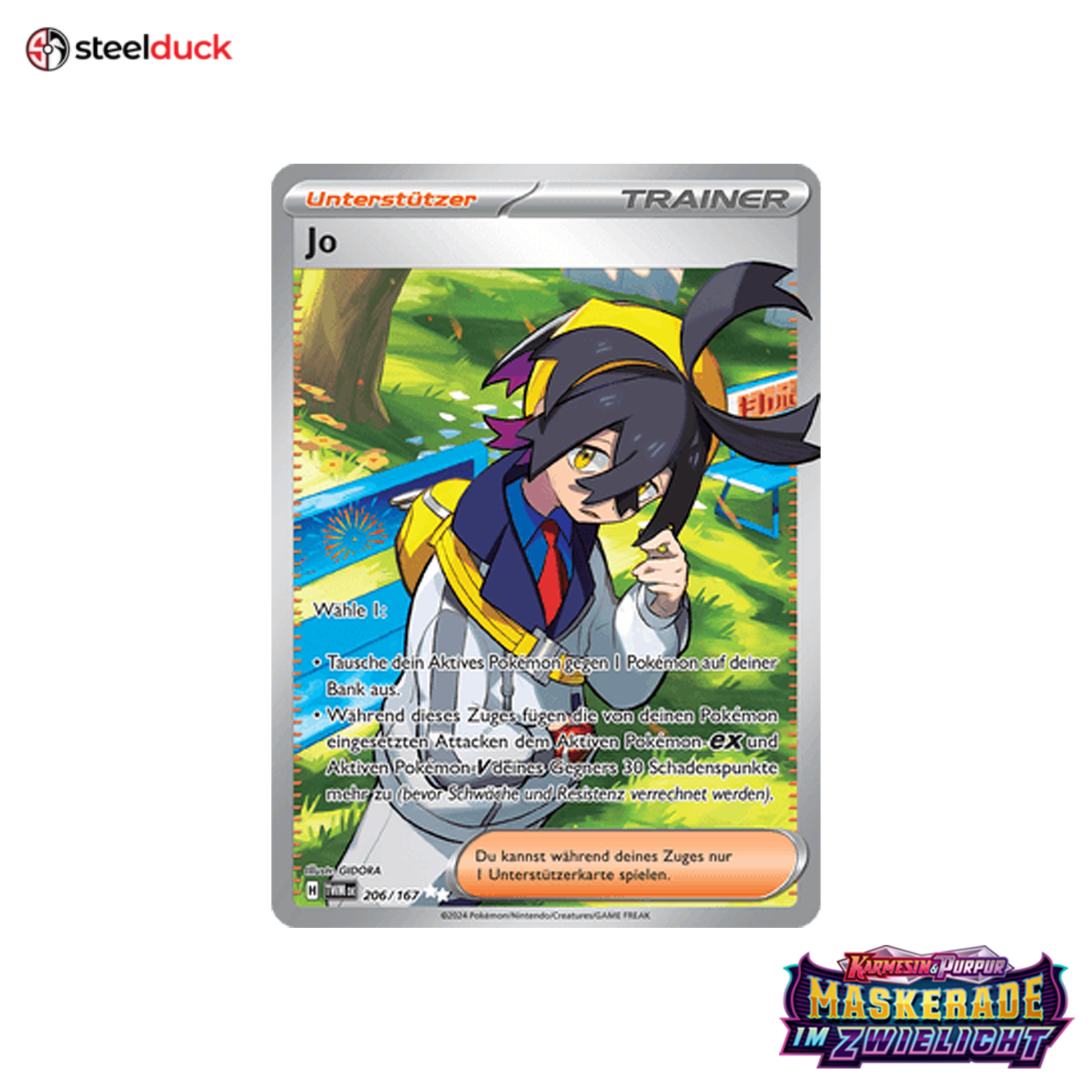 Die Karte Jo stammt aus dem beliebten Pokémon-Set Maskerade im Zwielicht und ist ein echtes Highlight für jede Sammlung.