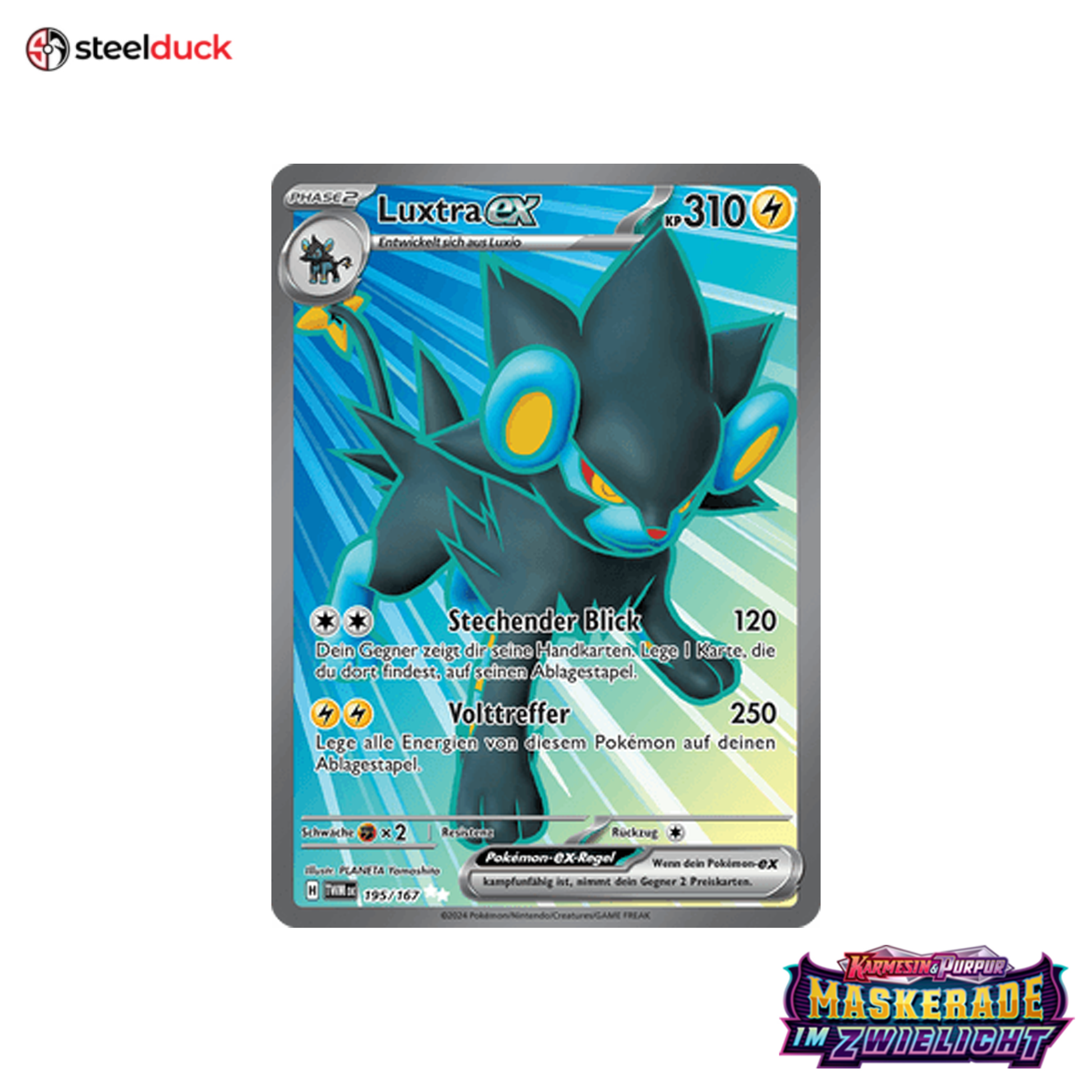 Die Karte Luxtra ex stammt aus dem beliebten Pokémon-Set Maskerade im Zwielicht und ist ein echtes Highlight für jede Sammlung.