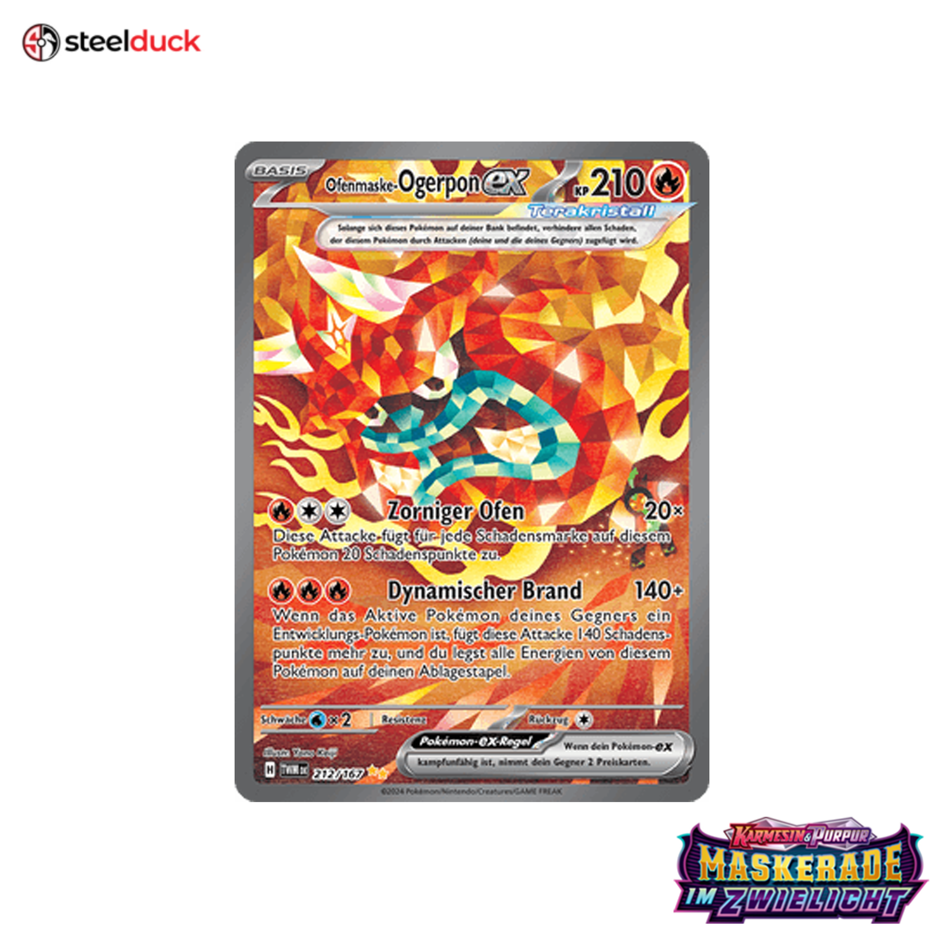 Die Karte Ofenmaske-Ogerpon ex stammt aus dem beliebten Pokémon-Set Maskerade im Zwielicht und ist ein echtes Highlight für jede Sammlung.