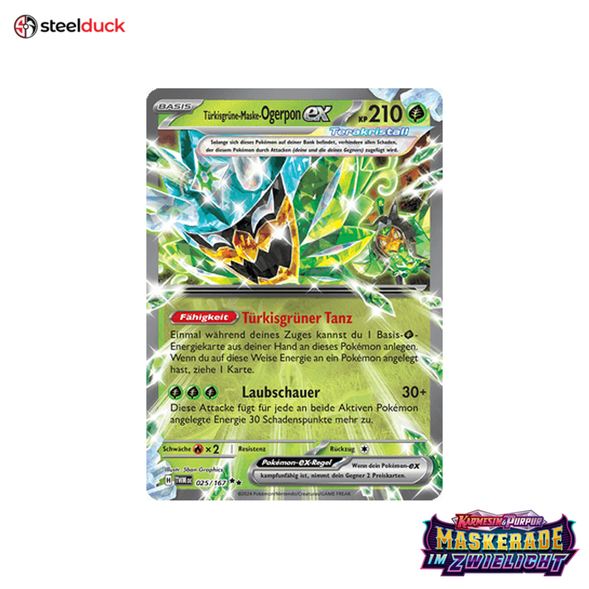 Die Karte Türkisgrüne-Maske-Ogerpon ex stammt aus dem beliebten Pokémon-Set Maskerade im Zwielicht und ist ein echtes Highlight für jede Sammlung.