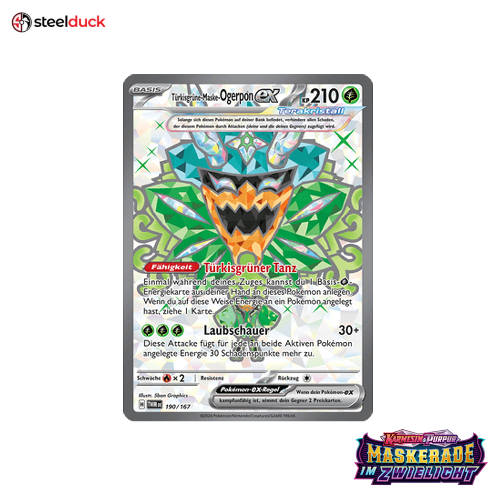 Die Karte Türkisgrüne-Maske-Ogerpon ex stammt aus dem beliebten Pokémon-Set Maskerade im Zwielicht und ist ein echtes Highlight für jede Sammlung.