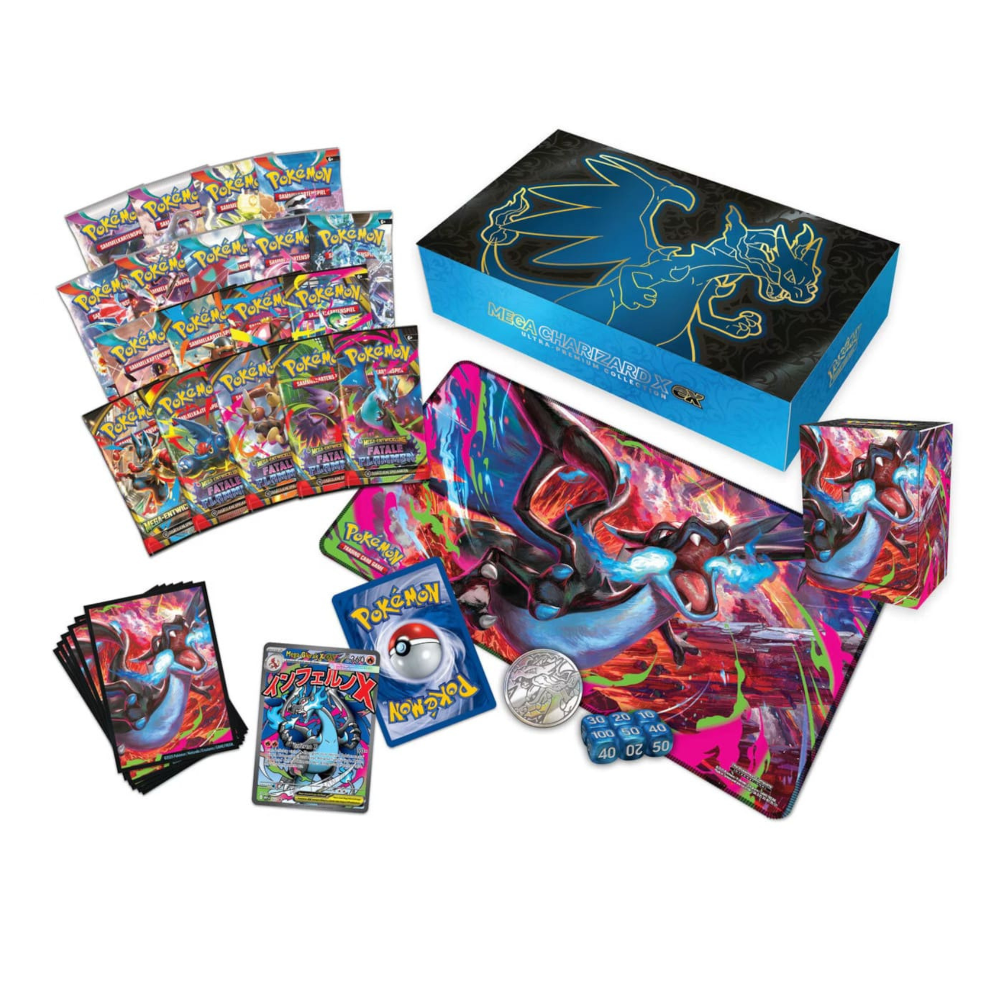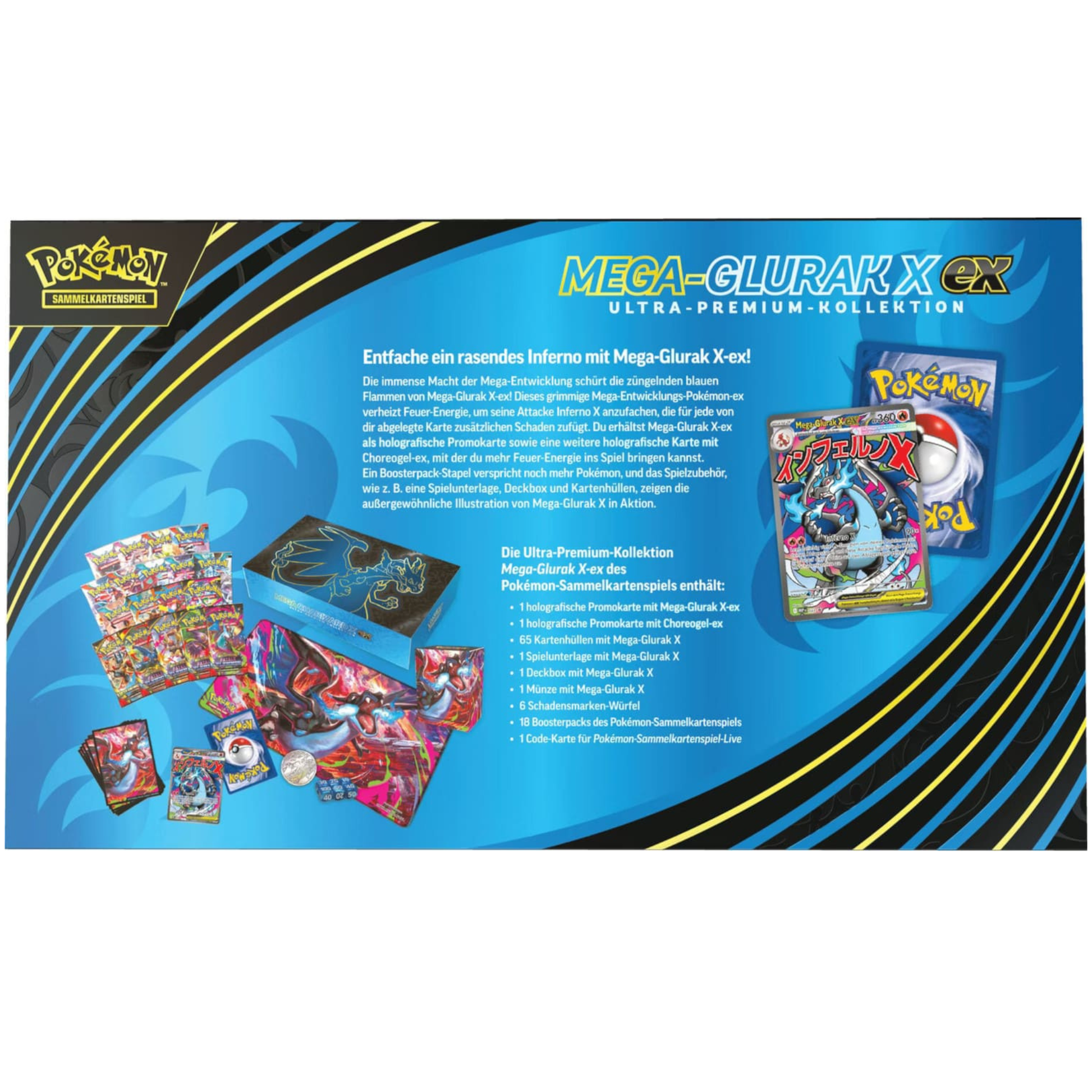 Erlebe die Macht der Mega-Entwicklung mit atemberaubenden Full-Art-Promokarten, hochwertigen Sammelartikeln und mehreren Boosterpacks der Erweiterung Fatale Flammen. Die gesamte Kollektion ist in einem edlen, schwarz-blauen Design gehalten, inspiriert von den legendären blauen Flammen von Mega-Glurak X.