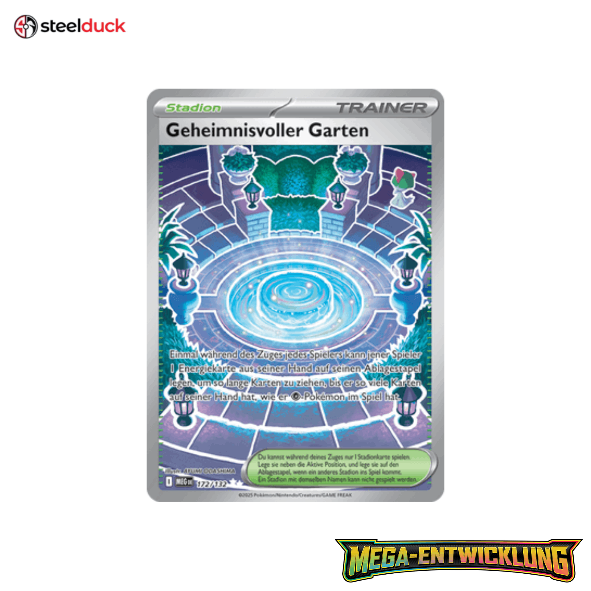 Die Karte Geheimnisvoller Garten stammt aus dem beliebten Pokémon-Set Mega-Entwicklung und ist ein echtes Highlight für jede Sammlung.