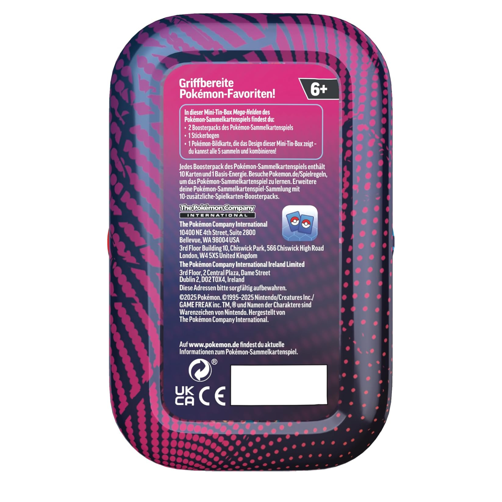 Diese fantastische Mini-Tin-Box „Mega-Helden“ zeigt eine tolle Illustration eines Mega-Pokémon wie Mega-Lucario und enthält alles, was Fans und Sammler begeistert. Jede Tin enthält zwei zufällig gewählte Boosterpacks des Pokémon-Sammelkartenspiels, einen Stickerbogen und eine Pokémon-Bildkarte, die das jeweilige Motiv der Box zeigt.
