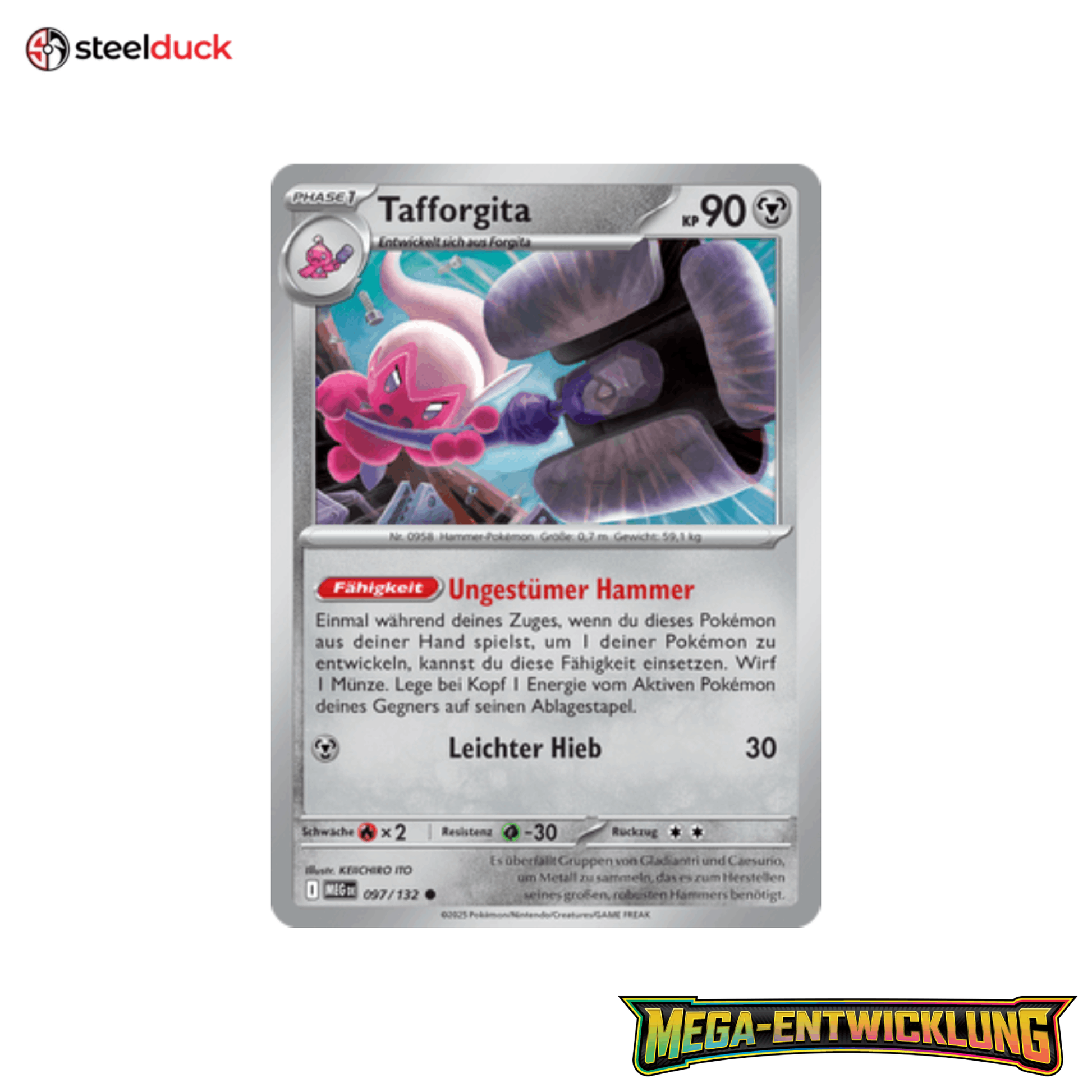 Die Karte Tafforgita stammt aus dem beliebten Pokémon-Set Mega-Entwicklung und ist ein echtes Highlight für jede Sammlung.
