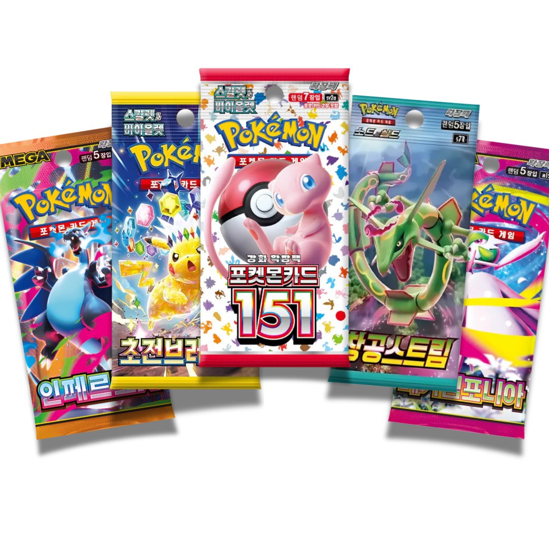 Du erhältst 5 zufällige Boosterpacks in koreanischer Sprache – ideal für ein spontanes Opening, als Abwechslung zu deutschen/englischen Packs oder als Geschenk für Pokémon-Fans.