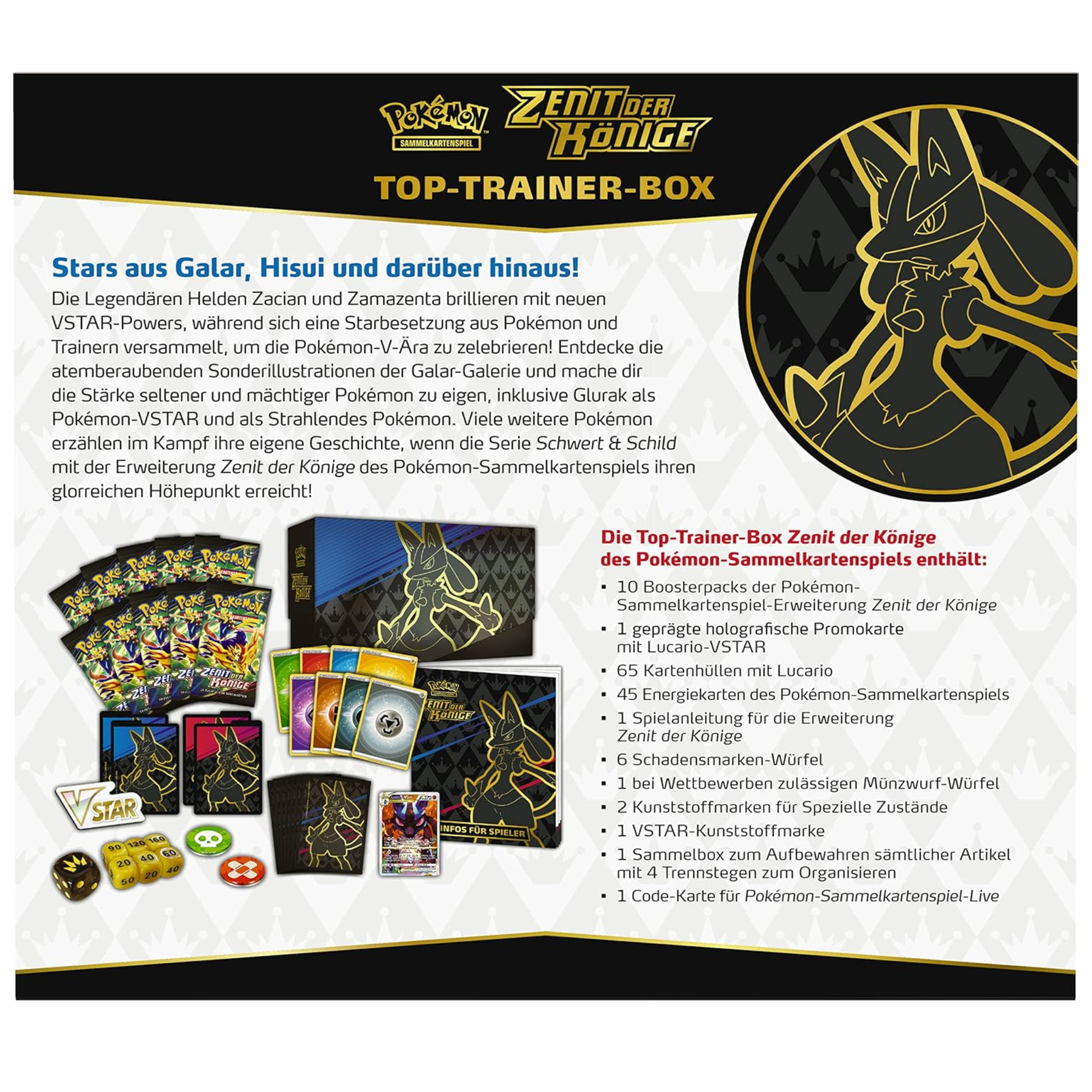 Mit vielen Boostern, einer exklusiven Promokarte, nützlichen Spielaccessoires und einer stabilen Sammelbox bietet diese Top-Trainer-Box alles, was Sammler und Spieler für einen starken Einstieg in das Set „Zenit der Könige“ benötigen.