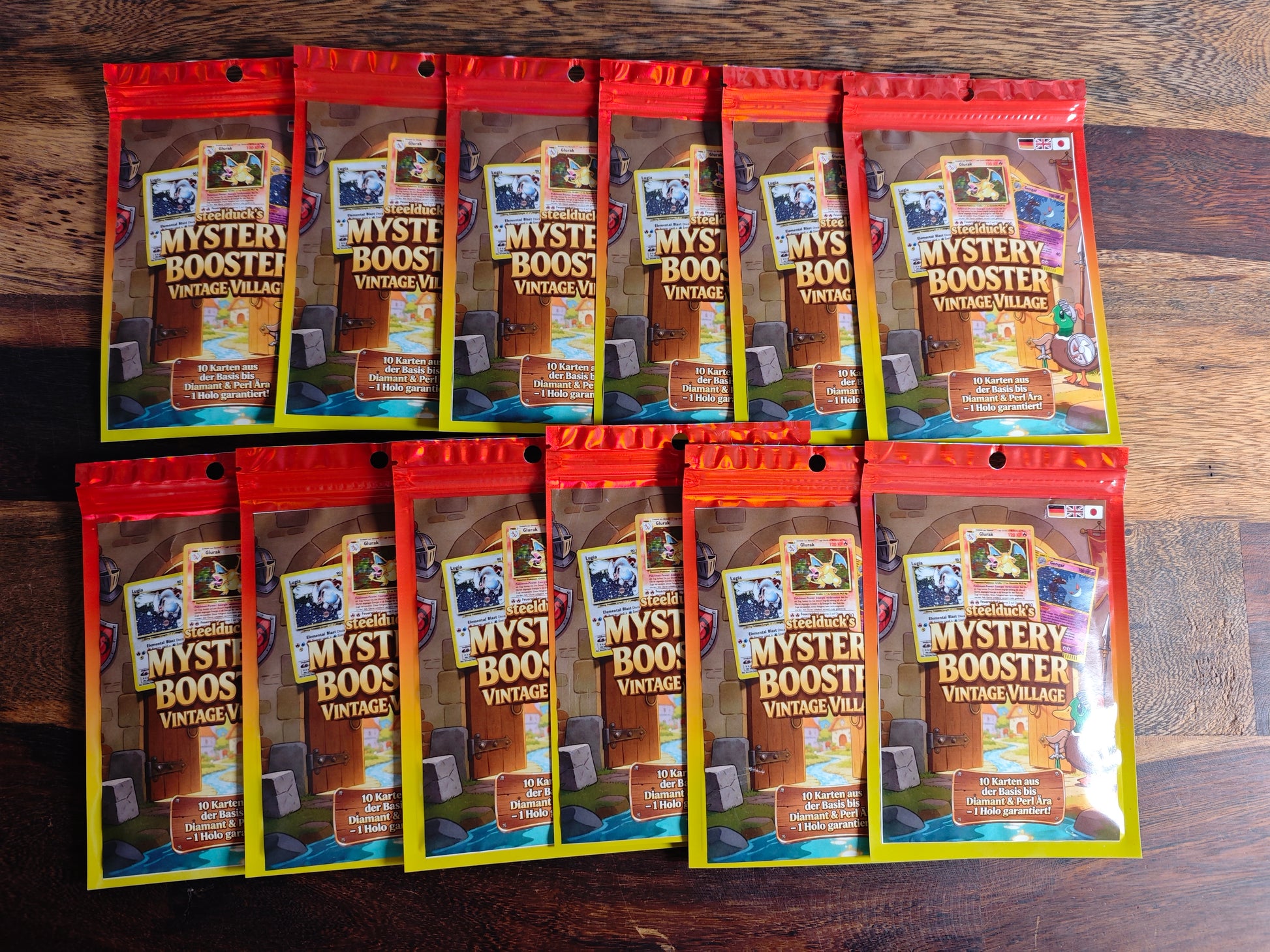 Das "Vintage Village" öffnet seine Tore. Mit diesem Mystery Booster erhältst du einen nostalgischen Mix aus 10 originalen Karten der alten Schule – von der Basis-Ära (1999) bis Diamant & Perl.